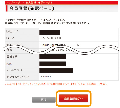 入力したお客様情報を確認し、OKであれば 【会員登録完了へ】 ボタンを押す。